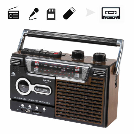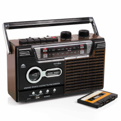 Sous son air 70’s avec sa façade façon bois, cette radio-cassette cache une virtuose. Où que vous soyez, vous ne manquerez rien de l’actualité avec ses 4 bandes d’ondes (FM, AM et SW1/ SW2). Vous réécouterez vos cassettes audio et profiterez de vos playlists sur USB ou carte SD (non fournie). Nostalgique de la cassette ? Vous pourrez y enregistrer des voix via le micro intégré, mais aussi radio ou musique stockée sur USB/carte SD.