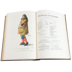 Ce superbe ouvrage est une réédition de l’intégralité des œuvres de Molière (1622-1673), d’après l’édition réalisée en 1679, soit 32 pièces en vers ou en prose et 6 créations poétiques. Elle est illustrée de 19 reproductions exceptionnelles de dessins et gravures en couleurs d’artistes de l’époque, représentant les principaux personnages de chaque pièce. Cette édition prestige est réalisée dans le respect du savoir-faire des artisans du livre. La reliure, en cuir véritable, d’un beau marron, comporte des coins rempliés manuellement, comme autrefois. La dorure sur tranches et les quatre “ faux nerfs ”, en relief sur le dos, signent cette édition d’exception.
