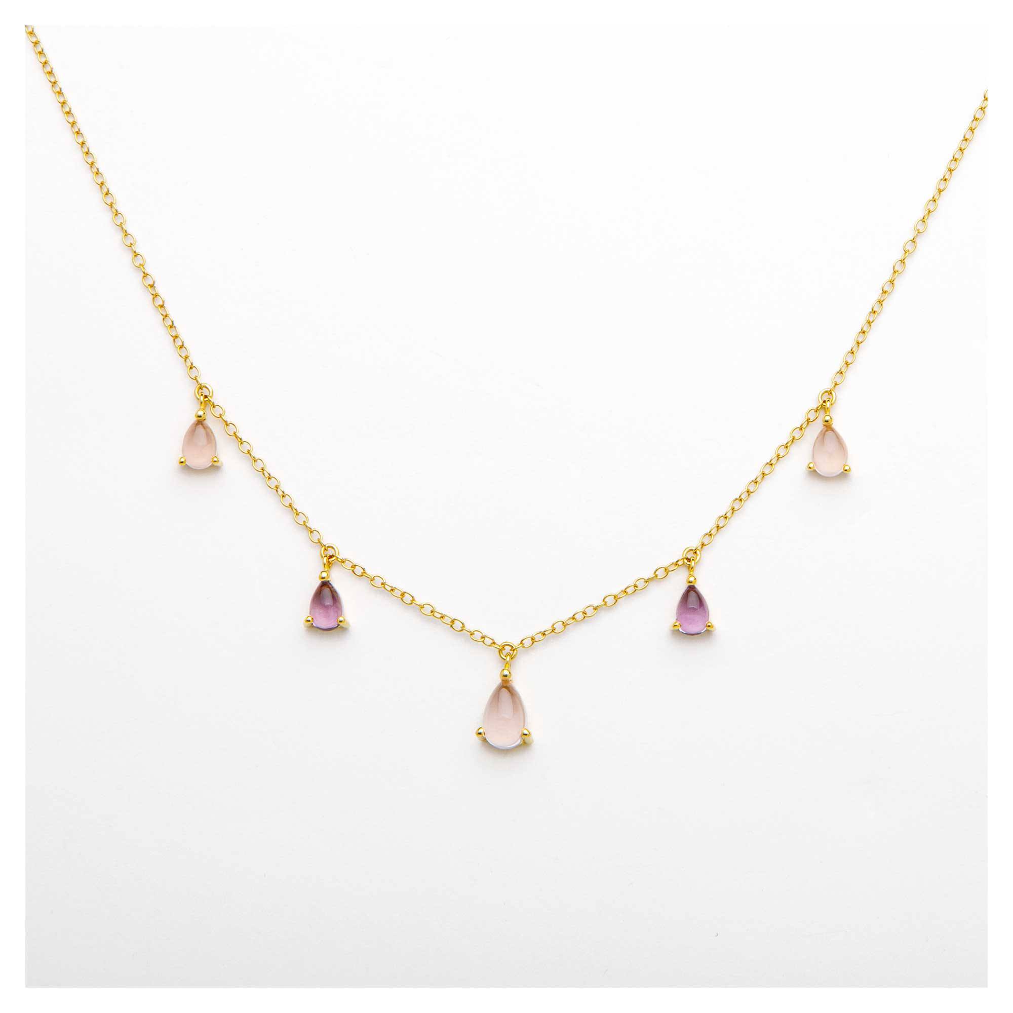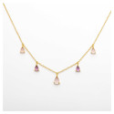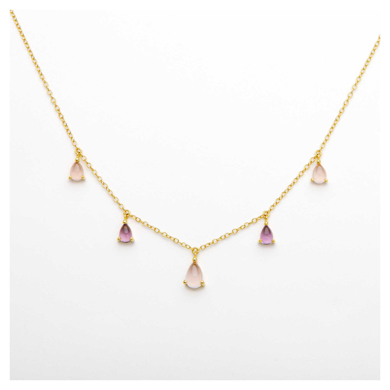 Ce collier délicat en or est orné de gouttes de pierres aux tons rose et violet, créant un jeu de couleurs subtil et raffiné. Chaque gemme suspendue ajoute une touche d’élégance et de féminité, parfait pour sublimer une tenue avec discrétion et sophistication.