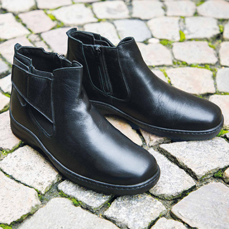En cuir lisse bien souple, ces boots sont un véritable havre de confort qui préserve des pressions et assure une bonne circulation. Leur 1re est en mouse à mémoire de forme pour se mouler à la morphologie de vos pieds et traitée Sanitized® afin d’empêcher le développement des bactéries. Leur doublure Coolmax® respirante évite tout échauffement. Enfin, elles s’enfilent facilement (zip) et s’adaptent au pied et à ses mouvements (élastique d’aisance et scratch d’ajustement).