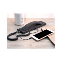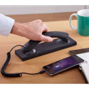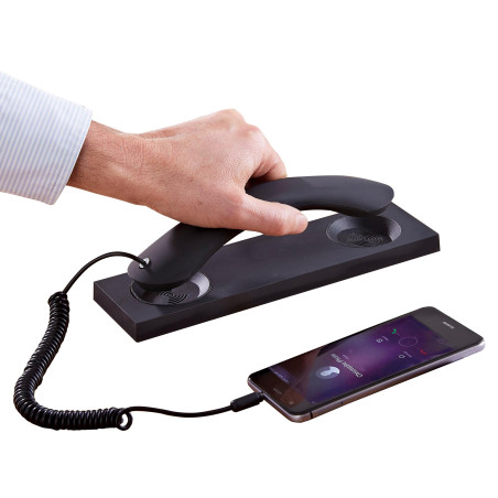 Pour de longues conversations téléphoniques, le mobile n’est pas forcément adapté : on a tendance à faire autre chose en même temps (et coincer l’appareil dans le cou, ouille !), le son n’est pas toujours optimal et l’exposition aux ondes plus importante. La solution ? Cet astucieux combiné ! Design et ergonomique, il suffit de le raccorder à la prise jack de votre mobile (câble fourni) et de profiter d’un vrai confort d’écoute… comme avec un téléphone fixe !