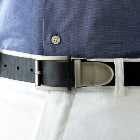 Dans un monde toujours plus connecté, cette ceinture arrive à point nommé... car elle vous permettra d’enregistrer et de transporter photos, chansons, vidéos, de manière insoupçonnable ! Comment ? Tout simplement parce que sa boucle intègre une clé USB 4 Go, à "dégainer" dès que nécessaire ! Soigneusement réalisée dans un cuir de vachette souple et robuste, voilà un accessoire que ne renierait pas le plus célèbre agent secret de sa majesté...