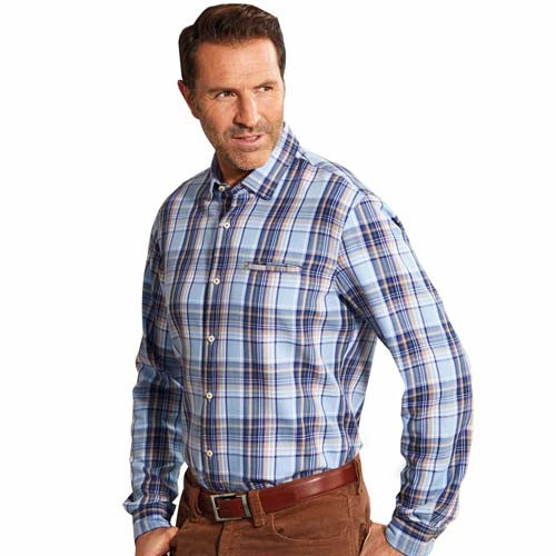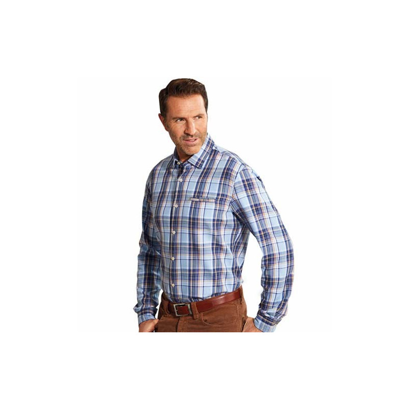 En coton tissé-teint au toucher proche d’une flanelle, elle se distingue par son jeu de carreaux à la géométrie tendance (mix de rayures larges et fines) et son lumineux camaïeu de bleus et beige. Détail luxe : sa poche poitrine passepoilée avec rivet métal siglé Cardin.