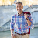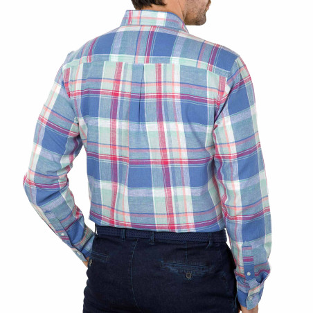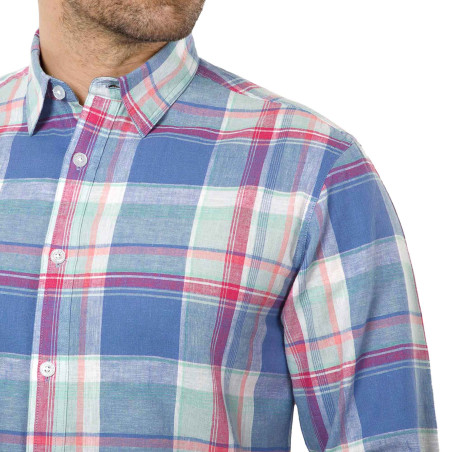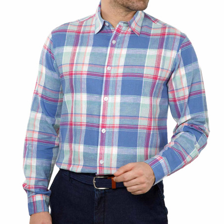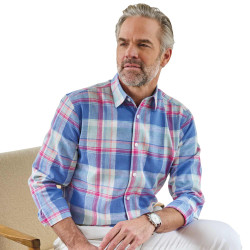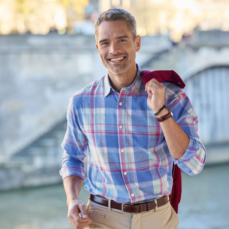 Douceur des couleurs pastel, bleu denim et rose, fraîcheur d’un tissé-teint en lin et coton, cette chemise conjugue à merveille mode et confort.