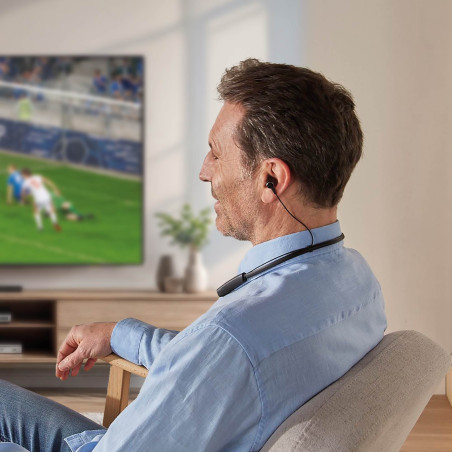 … avec cet amplificateur ultraléger : 28 grammes seulement ! Rechargeable, il permet d’écouter télé, radio ou musique sans augmenter le son (ni gêner votre entourage) et de participer plus facilement aux conversations. Simple d’utilisation, vous n’avez qu’à l’ajuster à tout moment au volume qui vous convient.