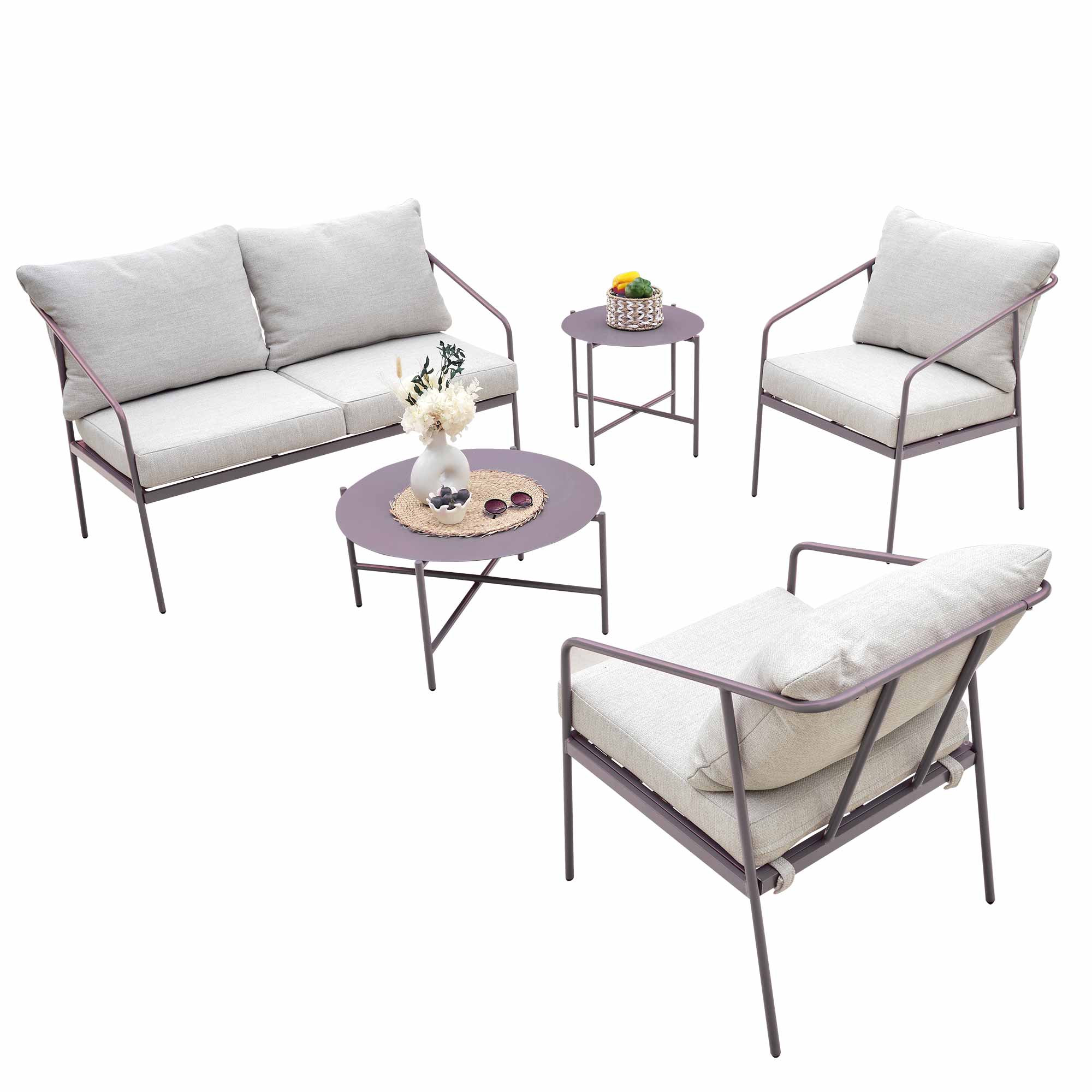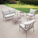Composé d’un canapé 2 places, 2 fauteuils et 2 tables basses de dimensions différentes, ce salon de jardin, aux lignes épurées adoucies par de généreux coussins et jouant sur une belle harmonie anthracite / gris clair, affiche une élégante modernité. Sous sa silhouette d’une légèreté aérienne se cache une structure en acier qui lui garantit robustesse et durabilité. Peu volumineux, il est aussi à l’aise dans les petits que dans les grands espaces et s’adapte à tout style de décor. Pratique pour l’entretien, les coussins sont déhoussables.