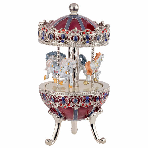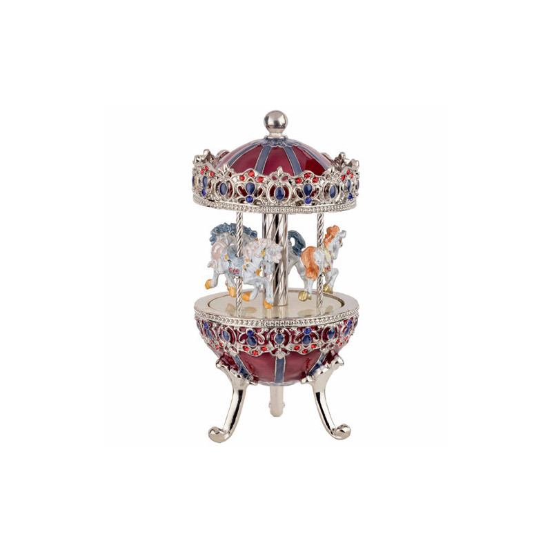 Cette boîte à musique est pour le moins originale ! Posé sur trois pieds, un œuf ouvert laisse entrevoir un traditionnel carrousel composé de trois chevaux. Lorsqu’on tourne le toit, le manège s’active sur la mélodie de la célèbre valse viennoise Le Beau Danube bleu, de Johann Strauss.