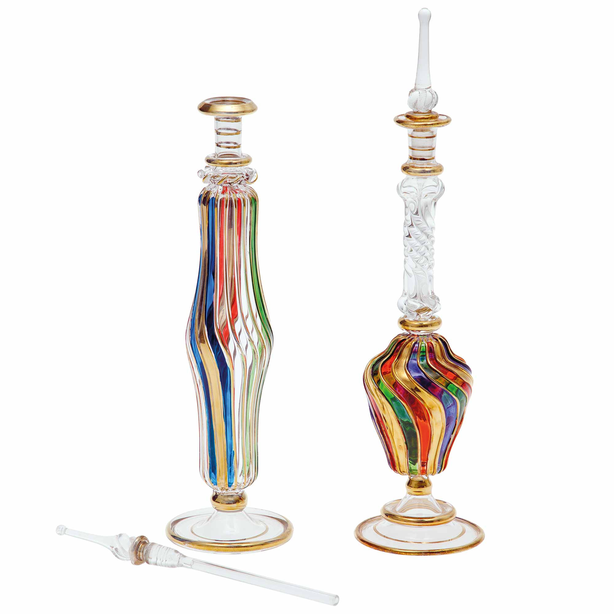 Remplissez ces deux magnifiques flacons en verre de vos huiles essentielles ou parfums préférés. Peints à la main et dorés à l’or fin, ils pourront également constituer de beaux objets de décoration.