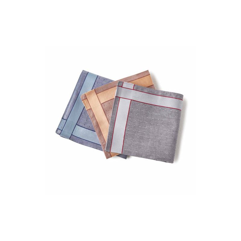 3 mouchoirs 100% coton longues fibres en coloris assortis (bleu, camel, gris). Fils coupés dessinant des motifs de micro-carrés, larges bandes satin uni sur les côtés.