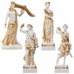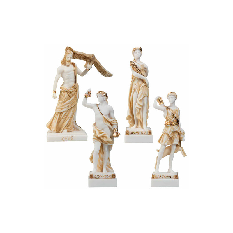 Ces quatre statuettes représentent quatre dieux de la mythologie grecque : Artémis, déesse de la nature sauvage, de la chasse et des accouchements, Déméter, déesse de l’agriculture et des moissons, Dionysos, dieu de la vigne, du vin et de ses excès, de la folie et de la démesure, et enfin Zeus, dieu suprême dans la mythologie grecque.
