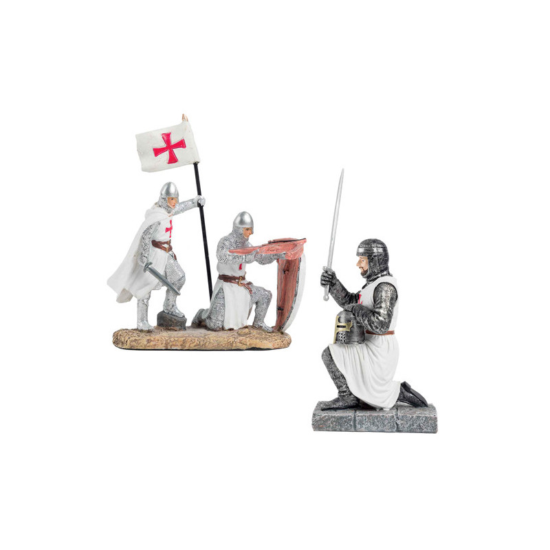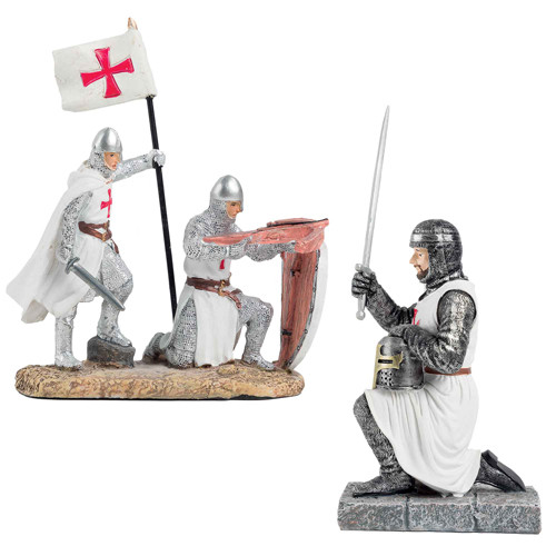 Ces deux figurines représentent des chevaliers de l’Ordre du Temple. Le premier, un Templier agenouillé, tient son épée dans sa main droite et son heaume de l’autre. Il est vêtu de son habit blanc marqué de la croix templière rouge. La seconde figurine représente deux chevaliers, l’un debout l’autre agenouillé, portant fièrement le drapeau de l’Ordre.