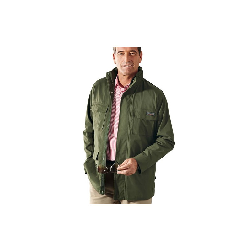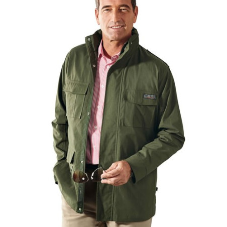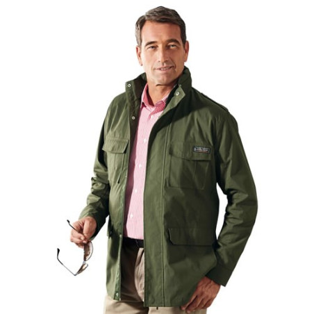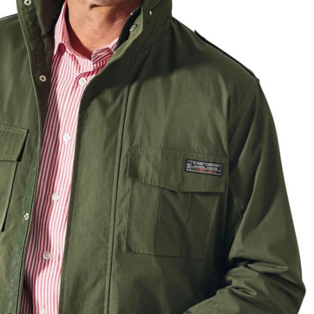 Le style de la saharienne (pattes d’épaules et poches plaquées) conjugué au confort et à la protection d’une parka ! En twill souple, d’un coloris kaki qui sied aux vêtements outdoor, elle a soigné ses détails de confection avec notamment une capuche dissimulée dans le col et un cordon de serrage à la taille.