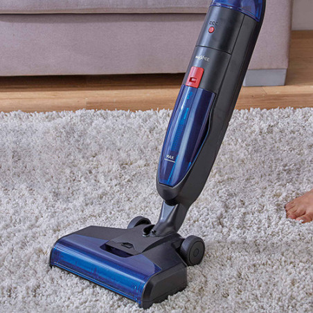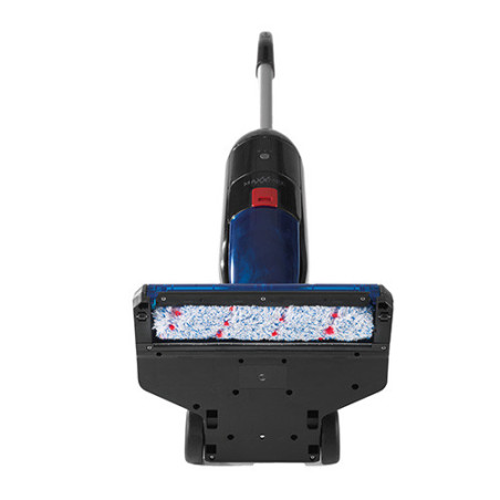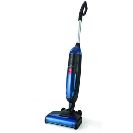 Fonctionne sur batterie rechargeable (adaptateur fourni). Hauteur : 115 cm ; dimensions tête : 26 x 23 x 5 cm env ; 2 roulettes. Fabrication ABS, PP, fer/acier. Livré avec 2 rouleaux de brosse. Réservoir eau usée/bac poussières : 300 ml ; réservoir eau propre : 400 ml.