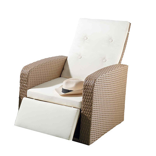 Outre la position assise offrant un excellent maintien du dos, il se transforme aisément (d’une simple poussée en tirant une manette) en fauteuil-relax : le dossier s’incline et le repose-pieds surélève vos jambes. Élégant et résistant (ne craint ni le soleil ni la pluie), son habillage aspect rotin «naturel» se nettoie d’un coup d’éponge et ses 3 coussins moelleux sont déhoussables pour le lavage. Sur la terrasse, dans une véranda, près de la piscine… vous voilà prêt pour lire ou faire la sieste.