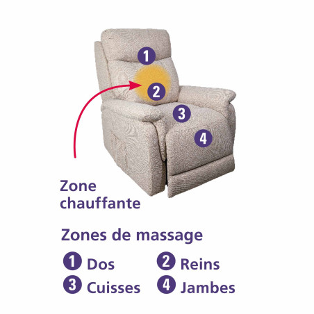 D’une sobre élégance avec son tissu aspect lin beige clair, ce fauteuil n’a d’autre mission que votre confort. Il vous accueille en douceur avec son système motorisé qui vous aide à vous asseoir, vous allonger et vous relever. Grâce à ses 8 modules massants (4 zones, 6 modes, plusieurs niveaux d’intensités, timer), il vous offre de purs moments de délassement, accompagnés ou non de chaleur. Enfin, toutes ses fonctions se pilotent via la télécommande.