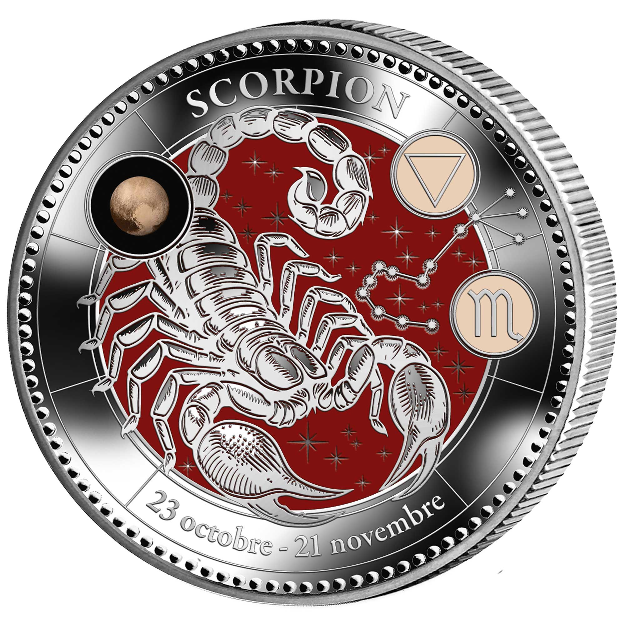 Le scorpion au magnétisme absolu : mystérieux, intense et inoubliable. Cette magnifique pièce de collection colorisée reprend les caractéristiques principales de ce signe : la planète maitresse, le glyphe, l'élément du signe, la constellation et les dates. À chaque signe du zodiaque correspond une couleur, qui concentre en elle les grands traits de caractère.