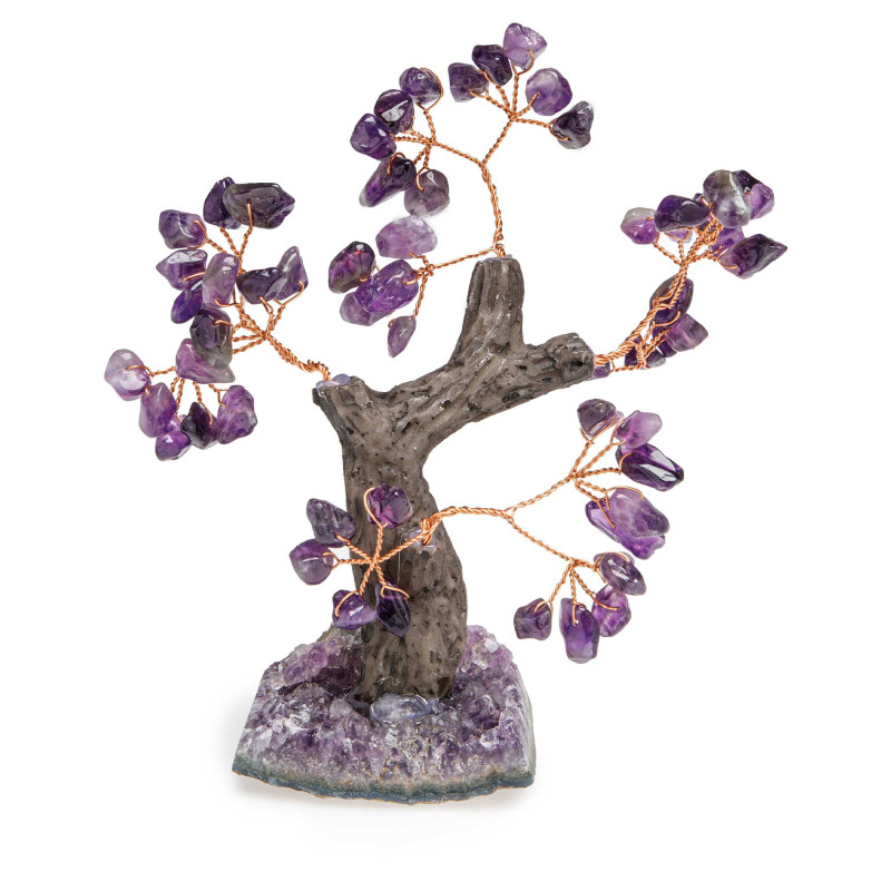 Dans diverses cultures, l’arbre de vie est symbole d’éternité et de paix. Il prend même une dimension précieuse avec ce bel objet décoratif : sa base est une géode d’améthyste (cristaux de roche naturels) et ses “ feuilles ” sont des améthystes polies aux envoûtants reflets violets. Pierre de la sagesse et de la sincérité, l’améthyste, en lithothérapie, apporterait calme et sérénité.