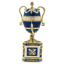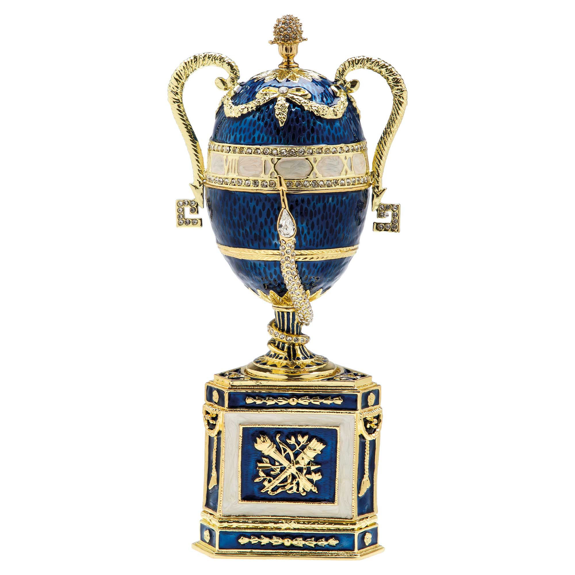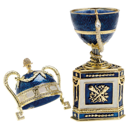 Laissez-vous envoûter par cet œuf bleu nuit, autour duquel s’enroule un serpent doré, incrusté de pierres brillantes. La langue du reptile, en forme de flèche, indique l’heure sur cette représentation d’une horloge horizontale. Ainsi est reconstitué l’œuf de style Fabergé offert par le Prince Reignier à la princesse Grace.