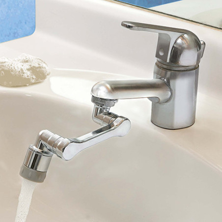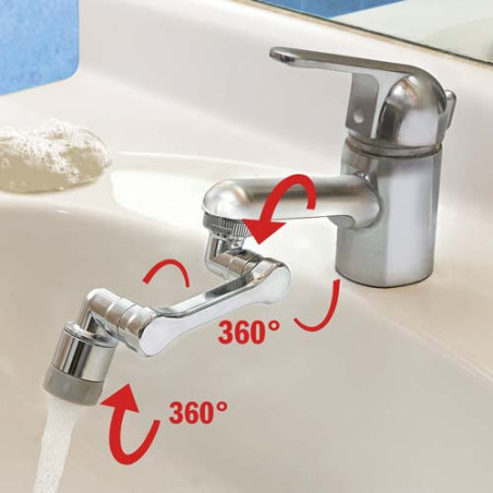 Simple à installer sur tous les robinets standards (cuisine et salle de bains), cet embout permet de diriger le jet d’eau dans toutes les directions grâce à son double axe de rotation (2 x 360°). Vous pourrez ainsi remplir un arrosoir, une bouteille ou nettoyer les bords de l’évier sans difficultés. Il intègre aussi un aérateur pour régler le débit (jet mousseur ou douchette) et économiser l’eau.