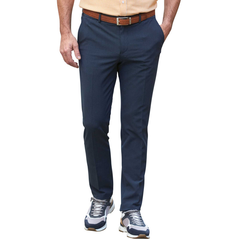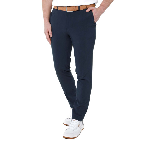 Un pantalon zéro souci pour une allure soignée, même en voyage ! Extensible, léger et infroissable, et aussi très élégant : son tissu n’est pas un uni classique, de discrètes rayures noir/bleu ajoutent un supplément de style.