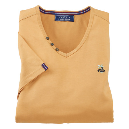 Ne vous contentez pas d’un banal tee-shirt ! Celui-ci donnera un look tendance à vos tenues estivales avec ses détails mode : col V souligné de 3 boutons, broderie palmier sur la poitrine et galon contrastant dans l’encolure et les fentes côtés