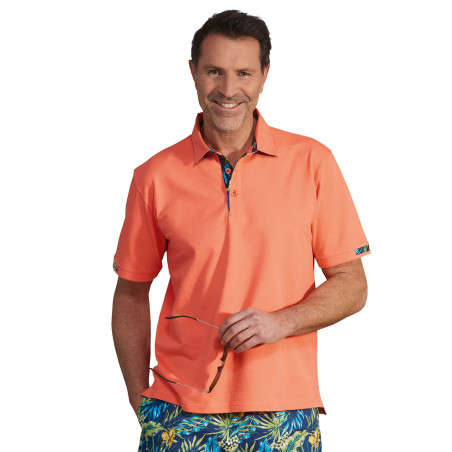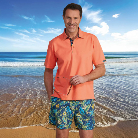 La mode est à l’évasion avec ce polo… En piqué de coton frais et irréprochable de tenue, il s’offre une touche de fantaisie avec ses motifs tropicaux placés (col, envers de patte de boutonnage, manches, fentes côtés) et parfaitement assortis au short ci-dessous !