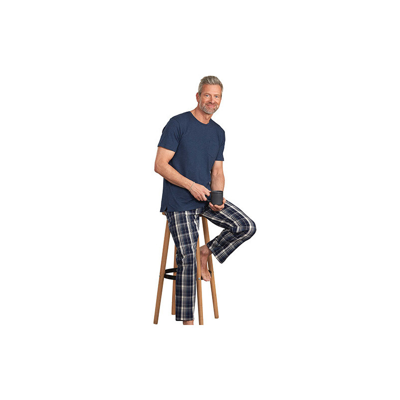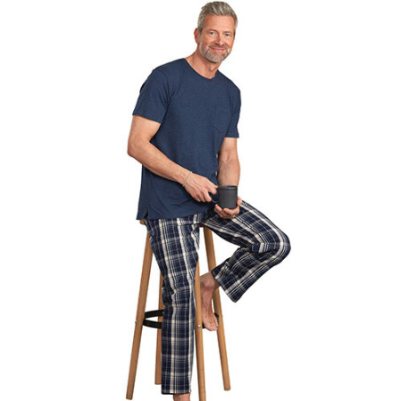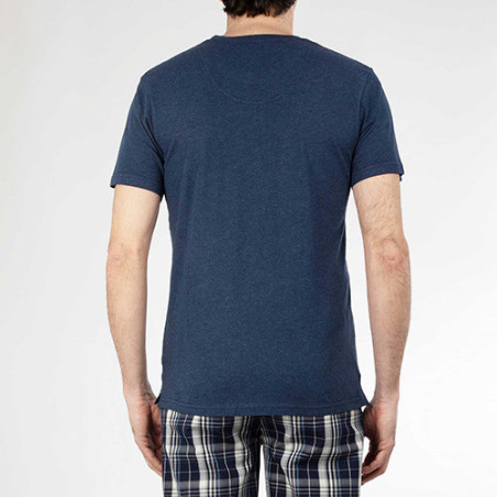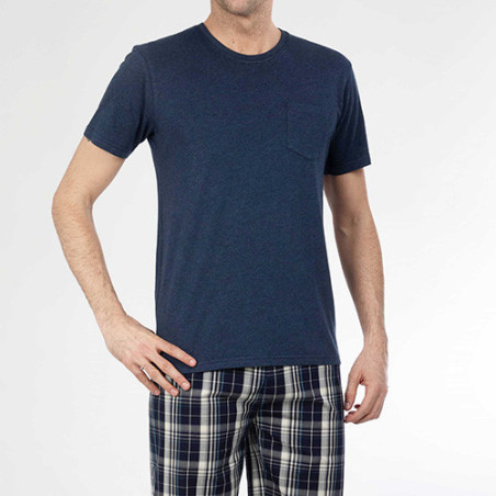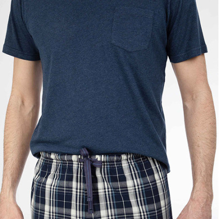 En mixant les matières, ce pyjama redouble de confort : le haut en jersey offre douceur et aisance ; le pantalon en tissu léger garantit fraîcheur et allure soignée (il ne se déforme pas). Détail chic : on retrouve le tissu à carreaux bleu dans les finitions du tee-shirt, à l’intérieur du col et des fentes côtés.