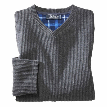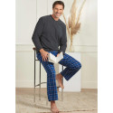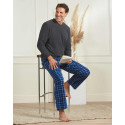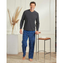 Haut uni gris col V ; pantalon à carreaux bleus, taille élastiquée, bas droit.
