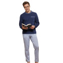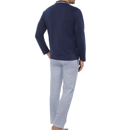 D’inspiration nautique avec ses coloris marine, ciel et blanc, ce pyjama en jersey pur coton (confort sain et belle douceur) affiche des détails stylés : poche poitrine et encolure du tee-shirt sont soulignées d’un liseré à rayures qui fait écho au motif du pantalon.
