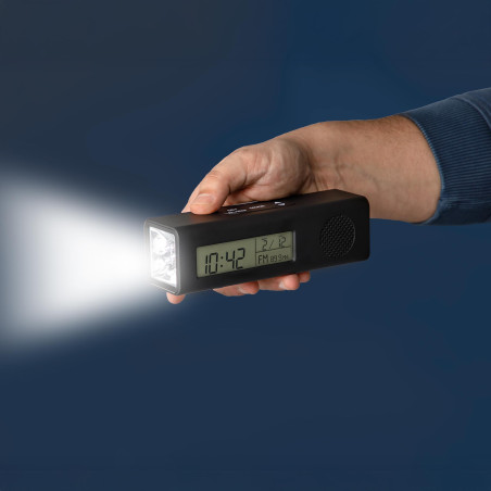 Ultracompact, autonome (sans fil), ce réveil intègre une radio FM mais fait également office de lampe torche : pratique si vous avez besoin de vous lever la nuit ! Il possède aussi un minuteur et une alarme spécial anniversaire. Indispensable sur la table de nuit, mais aussi dans le bureau et pour les vacances (mobil-home, hôtel, gîte…).