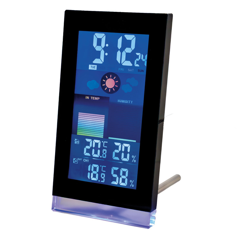 D’un élégant design avec son habillage laqué noir et sa base lumineuse, elle bénéficie surtout d’un superbe écran couleur sur lequel s’affichent toutes les données nécessaires : températures et hygrométries (intérieures/extérieures) avec bargraphe, icônes météo animées, mais également heure, date et jour. Avec elle, la météo n’aura jamais été aussi agréable à regarder !