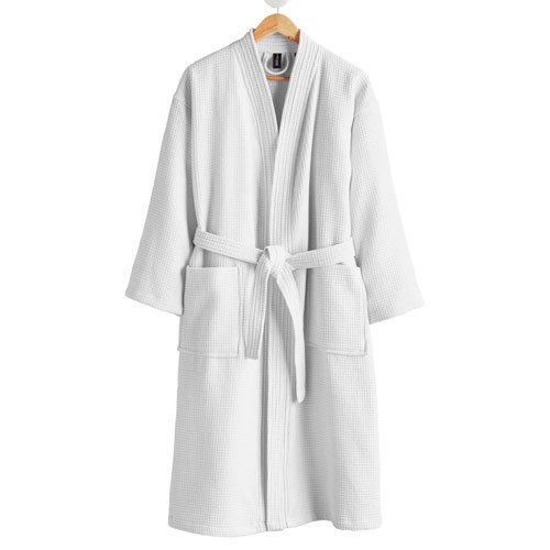 Peignoir mixte, forme kimono, 2 poches, ceinture sous passants. Accroche-patère.