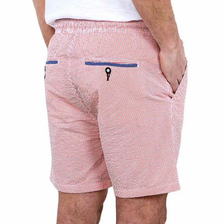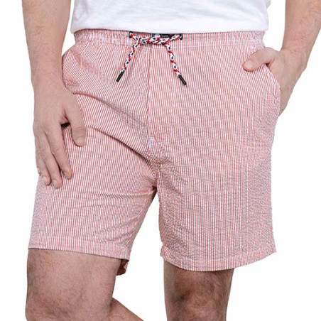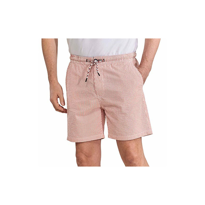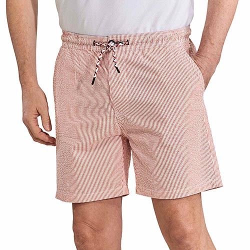 Pour rester élégant même en cas de fortes chaleurs, rien de tel que le confort du seersucker. Ce tissu au léger gaufrage assure excellente ventilation et allure soignée puisqu’il est infroissable. D’une coupe privilégiant l’aisance (cordon de serrage à la taille), ce bermuda affiche aussi des détails raffinés (bouton, lien de serrage et poches arrière contrastés).