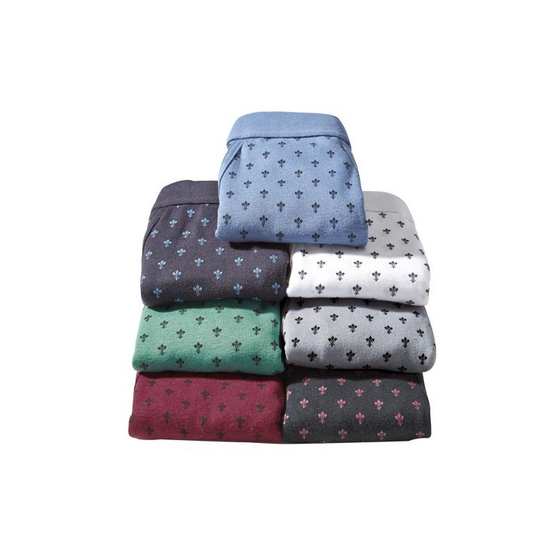 En maille pur coton, ils possèdent bien sûr l’indispensable poche latérale et une large ceinture étudiée pour ne pas serrer. Côté style, ils affichent l’emblème des rois de France : un motif «fleur de lys» décliné sur 7 coloris (bleu, marine, blanc, vert, gris, bordeaux et noir). Fond doublé.