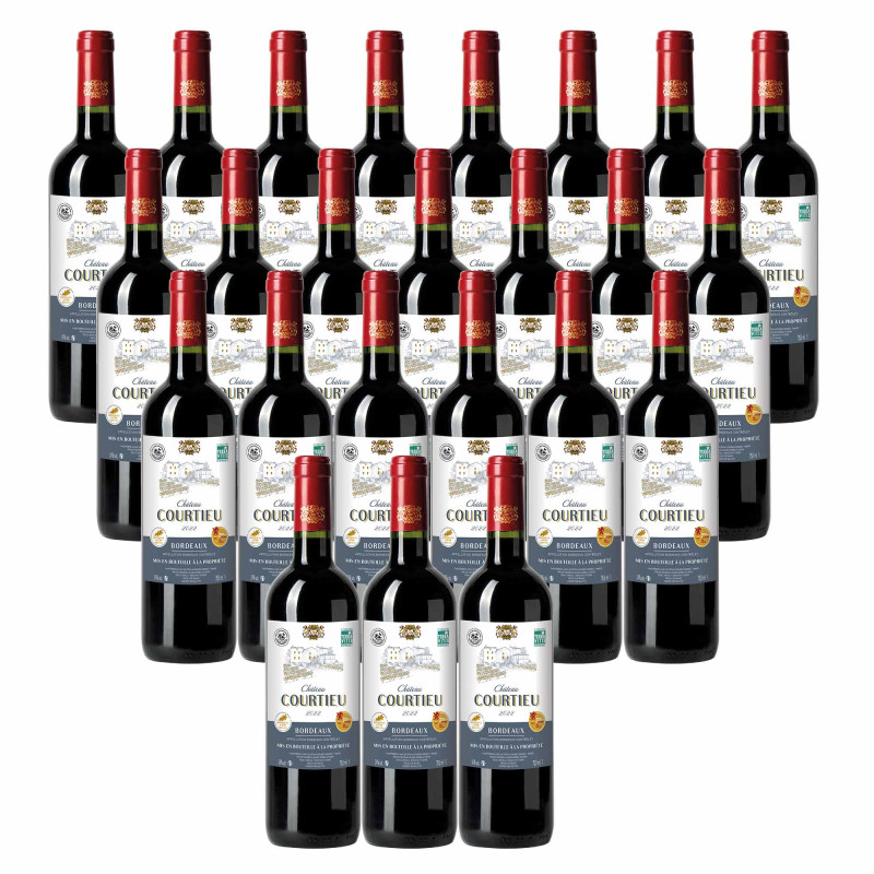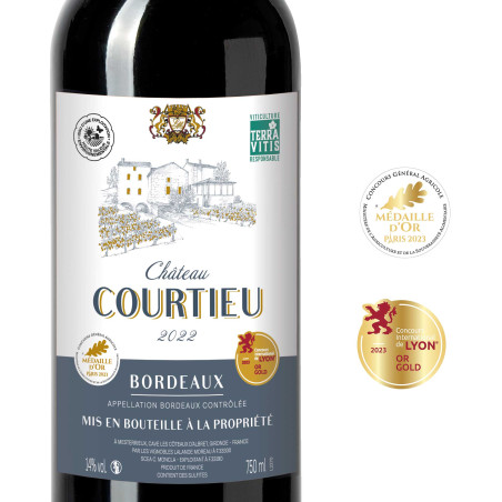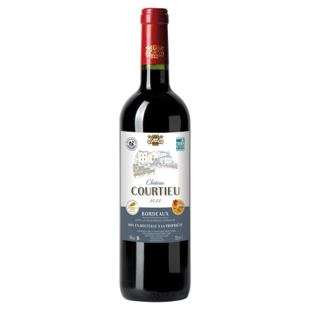 Amateurs éclairés et épicuriens se réjouiront d’accueillir à leur table (ou dans leur cave !) ce bordeaux rouge Château Courtieu 2022 ! Récompensé par 2 médailles d’or et labélisé HVE (haute valeur environnementale), il est issu d’un vignoble situé sur la commune de Saint Hilaire de la Noaille, en Gironde. À la fois fruité et charnu, il est composé d’un subtil assemblage de Merlot (50%), Cabernet Sauvignon (41%) et Cabernet Franc (9%).